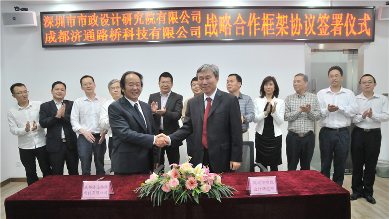 2017年4月24日下午,我公司與成都濟(jì)通路橋科技有限公司(以下簡(jiǎn)稱“濟(jì)通科技”)戰(zhàn)略合作框架簽署儀式在公司一樓技術(shù)交流中心舉行,董事長(zhǎng)陳宜言設(shè)計(jì)大師和濟(jì)通科技伍廷貴董事長(zhǎng)代表雙方簽字。蔡明總經(jīng)理、宋榮亮主席、郭明副書記、王建新副總經(jīng)理、張健君副總經(jīng)理、許華林副總經(jīng)理、徐波總工程師以及相關(guān)部門負(fù)責(zé)人和專業(yè)總工,濟(jì)通科技伍大成總經(jīng)理、趙鵬賢副總經(jīng)理,鄒貽軍技術(shù)總監(jiān)、技術(shù)部高建主任出席簽署儀式。儀式由我公司黨委副書記、紀(jì)委書記、工會(huì)主席郭明主持。