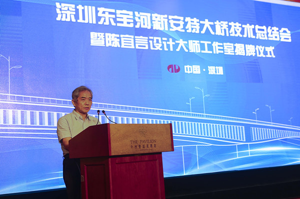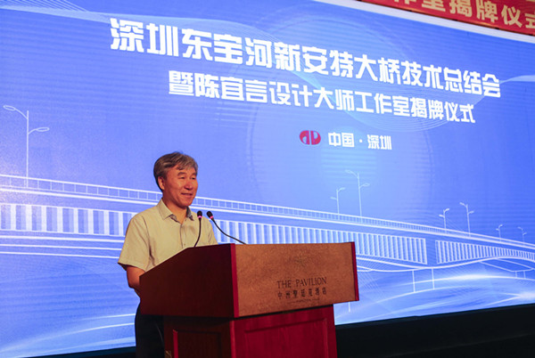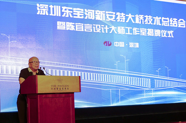 2017年7月29日,深圳東寶河新安特大橋技術(shù)總結(jié)會暨陳宜言設(shè)計大師工作室揭牌儀式在圣廷苑酒店隆重舉行。中國工程院孟建民、聶建國、陳政清等3位院士,全國工程勘察設(shè)計大師王用中、羅玲(女)、車宇琳、丘建金、何昉等7位大師,11所全國重點高校15名組合結(jié)構(gòu)教授,以及深圳市委組織部、市科協(xié)、市交委、市國資委、市住建局、市地質(zhì)局、市人社局、國新南方知識產(chǎn)權(quán)研究院、地鐵集團領(lǐng)導(dǎo),行業(yè)協(xié)會領(lǐng)導(dǎo)及專家160余人出席大會。地鐵集團陳湘生總工程師主持會議,陳宜言設(shè)計大師和清華大學(xué)聶建國院士、東南大學(xué)宗周紅教授分別作了專題技術(shù)報告。