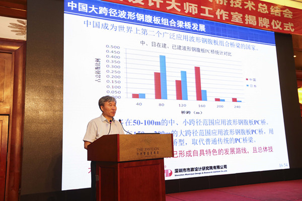 揭牌儀式后進入技術(shù)交流環(huán)節(jié),陳宜言設(shè)計大師、清華大學(xué)聶建國院士和東南大學(xué)的宗周紅教授先后作了關(guān)于波形鋼腹板組合梁橋和鋼結(jié)構(gòu)橋梁的技術(shù)報告。報告依托陳宜言大師技術(shù)團隊設(shè)計的深圳東寶河新安特大橋和伊朗德黑蘭BR-06L/R特大橋,在體系研究、方案設(shè)計、試驗研究、實橋試驗及創(chuàng)新性成果等方面進行了細致的介紹。