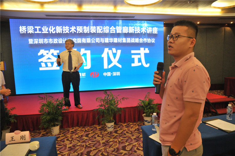 為加強(qiáng)院、企合作,提升院、企技術(shù)水平和創(chuàng)新能力,有效貫徹國(guó)家、省、市建設(shè)主管部門關(guān)于發(fā)展建筑產(chǎn)業(yè)化的相關(guān)要求,促進(jìn)建筑產(chǎn)業(yè)化在市政工程中的應(yīng)用,加強(qiáng)行業(yè)間學(xué)術(shù)和技術(shù)交流,2017年10月13日,“橋梁工業(yè)化新技術(shù)、預(yù)制裝配綜合管廊新技術(shù)講座”暨“深圳市市政設(shè)計(jì)研究院有限公司與建華建材集團(tuán)戰(zhàn)略合作協(xié)議簽約儀式”在深圳舉行。會(huì)議由深圳市市政設(shè)計(jì)研究院有限公司、建華建材集團(tuán)聯(lián)合舉辦,并邀請(qǐng)我國(guó)市政行業(yè)知名專家學(xué)者來(lái)深主講,深圳市市政行業(yè)設(shè)計(jì)、施工、建設(shè)、管理單位,以及來(lái)自多個(gè)省市的市政行業(yè)領(lǐng)導(dǎo)和相關(guān)技術(shù)人員共200人參會(huì),會(huì)議由我公司徐波總工程師主持。