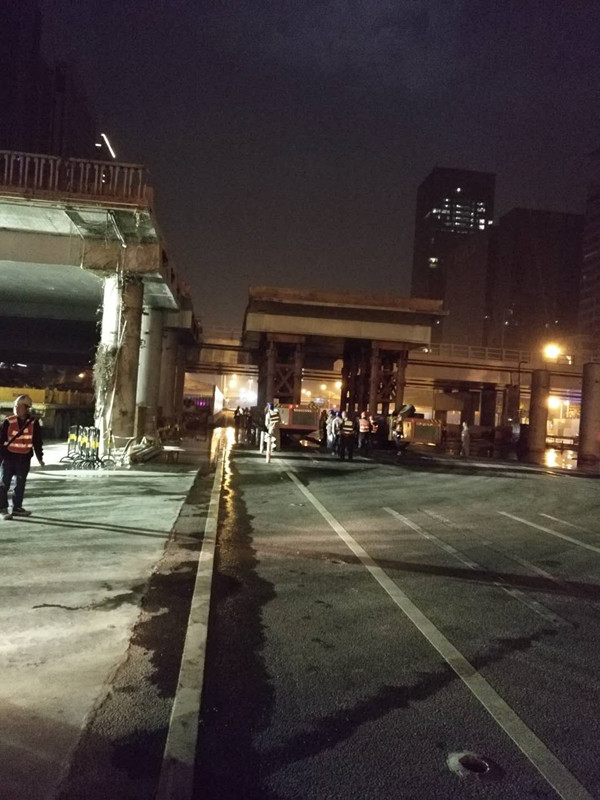 施工單位提前完成橋面設(shè)施拆除、鉆孔、設(shè)備安裝等準(zhǔn)備工作后,2017年12月29日晚11點(diǎn)開始拆橋工作,至2018年1月2日凌晨4點(diǎn)深南大道南北兩側(cè)交替封道4晚,彩田橋中間4跨連續(xù)梁采用SPMT模塊車順利拆除。拆除橋梁長(zhǎng)度約200m,共切割成22段梁體,單個(gè)梁體最大重量達(dá)300t,是目前國內(nèi)首座采用SPMT模塊車快速拆除的預(yù)應(yīng)力混凝土連續(xù)梁橋。全橋拆除時(shí)間與建設(shè)福田樞紐時(shí)60天拆除益田橋相比,時(shí)間僅為其1/6,我公司的技術(shù)創(chuàng)新充分證明了“深圳速度”,而且為橋梁工程的發(fā)展增添了寶貴經(jīng)驗(yàn)。