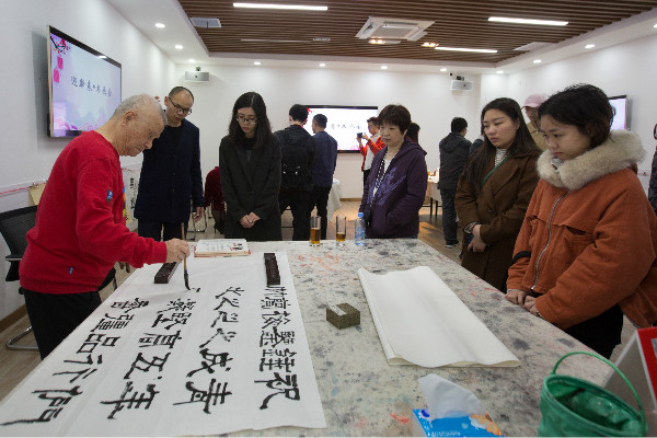 深漂藝術(shù)家魏治平老師在創(chuàng)作的間隙,為大家講述了書畫的精神內(nèi)涵以及在新時代下他對書畫的理解,生動地將“青春踐行十九大”、“幸福都是奮斗出來的”、“逢山開路遇水架橋”等文字融入自己的書畫創(chuàng)作中,令在場的青年員工受益匪淺。