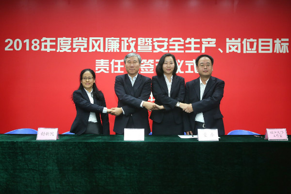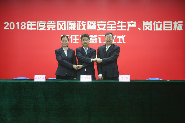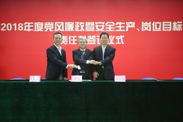 黨委書記、董事長(zhǎng)陳宜言與黨委副書記、總經(jīng)理蔡明和黨委副書記、紀(jì)委書記、工會(huì)主席郭明簽署責(zé)任書